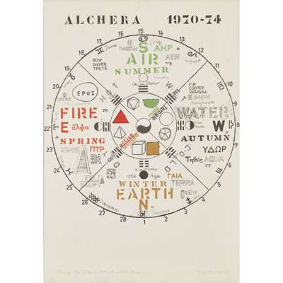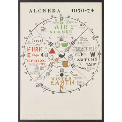 Almost contemporary with the Hockney is a work by Joe Tilson from 1968. Tilson's early work had been in a realist style but quickly moved to abstraction and by the early 1960s had began to produce pieces in brightly coloured wood remininscent of childrens' toys. Tilson's screenprints often transform this imagery into a two-dimensional format or provide a commentary to his oeuvre.