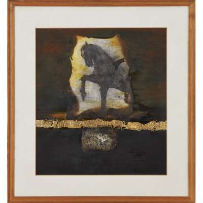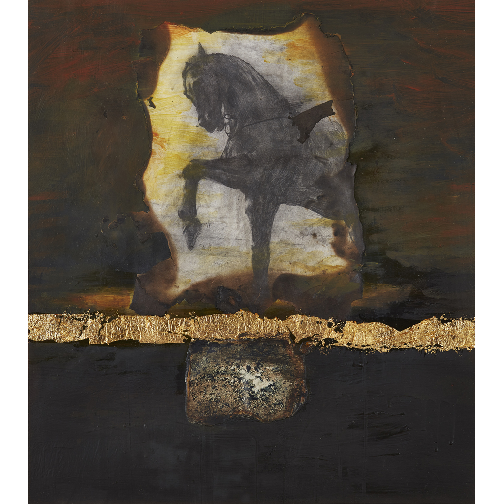 Signed and dated 1989 verso, oil, gold leaf, collaged drawing and photogrpahy on paper