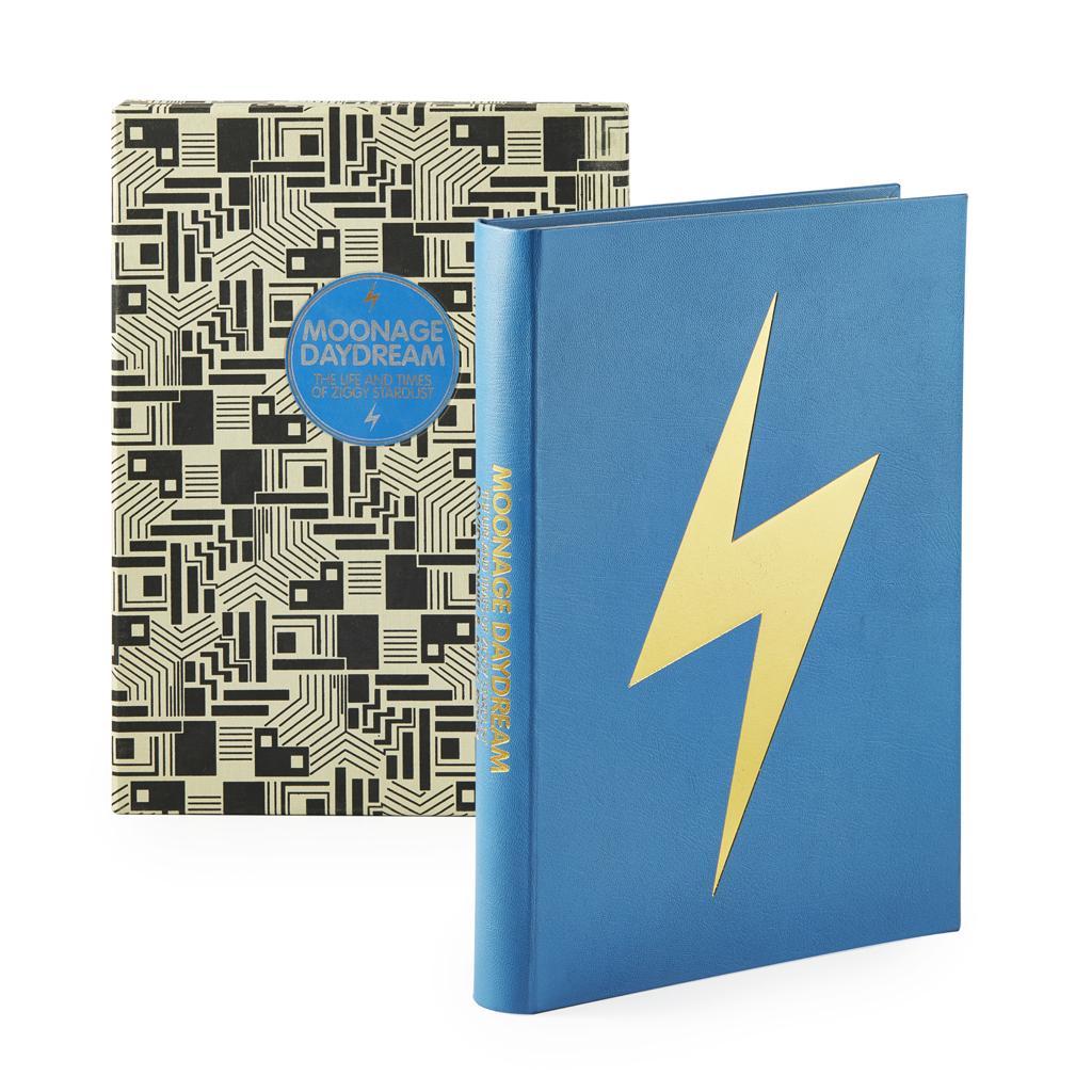 Genesis Publications (2002), No. 297 of a Deluxe limited edition of 350. Signed by David Bowie and Mick Rock, bound in full blue leather, with embossed gold Ziggy lightning bolt. Original Solander box. Includes a deluxe print signed by Mick Rock
