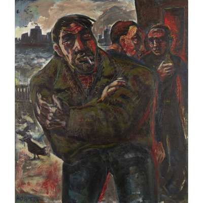 In his early works such as these offered here for sale, Howson concentrated on characterizations of working class men, at the gym, at football matches, in the pub, or merely in a crowd. The exemplar was his iconic painting The Heroic Dosser (1987, National Galleries of Scotland). Tied up with such subject matter were his own memories of the brutality of his life as a soldier, together with his having been victimized and bullied at school and the sexual abuse he had suffered as a child.