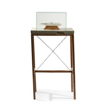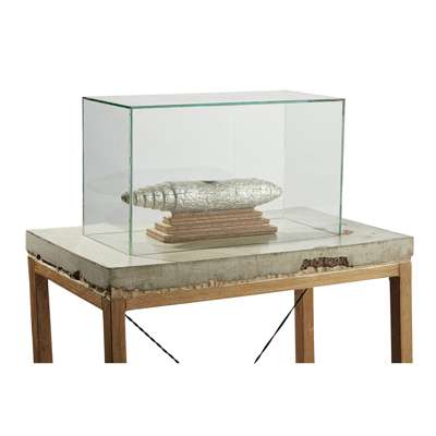 Here, Maquette is presented within an artworld convention, raised on a plinth, under protective and distancing glass, which indicates to us that we are to take it seriously. It is even raised on a stepped wooden base, raising it higher as though some kind of offering, yet the sculpture's surface is that of straightforward crumpled foil. It is designed to hold a candle, in many traditions a weighty responsibility, yet the flame has been allowed to burn down to the surface of the sculpture, the black, sooty surface recalling a forgotten flame, or hastily extinguished cigarette. Maquette is both strong and delicate, has a three-dimensional weight and presence yet seems made of simple lines, can recall basic building materials, or a powerful, destructive weapon. It is difficult to grasp fully, but encourages close looking and serious contemplation; any meanings or references are layered, subtle and ephemeral and can vary by viewer, location, mood, moment.