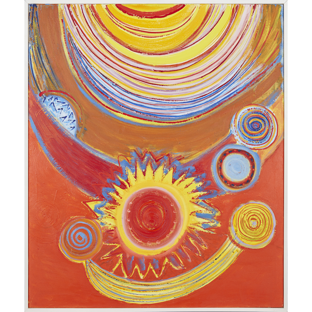 Like Alan Davie he also began to develop a language of symbols: using chevrons, crescents, lozenges, triangles and in particular spirals, to great effect. By the early 1970s Frost had created his signature style, experimenting with complimentary colours, and powerful abstract forms.