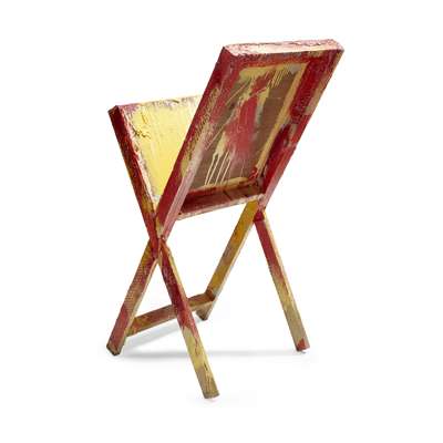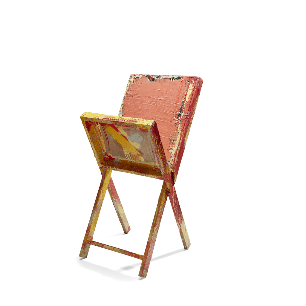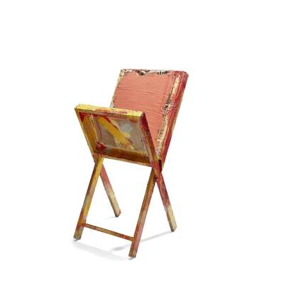In this work, Barlow takes the recognisable structure of a folding chair, with a flat base and back, and reconfigures it. By keeping the chair's structure between open and shut, usable and stored, it becomes precarious; we are aware we would tumble over if we tried to use it for its intended purpose and it becomes unclear whether it is in the process of opening or closing, folding or unfolding. This is common in Barlow's work, where she often creates installation's that expand into a space or room, ultimately redefining it. She does so using cheap, builder's materials such as plywood and cement, rather than the hallowed sculptor's bronze or marble. In Individual Chair, the simple structure has added texture, through the rough edges of the wood, and areas of hastily applied cement, while the very application of the paint draws attention to its materiality, offering a visceral sense of the process of making; it drips, gloops and congeals, and continues to look as though it would be tacky to touch, as if the artist has only just finished making it in her studio.