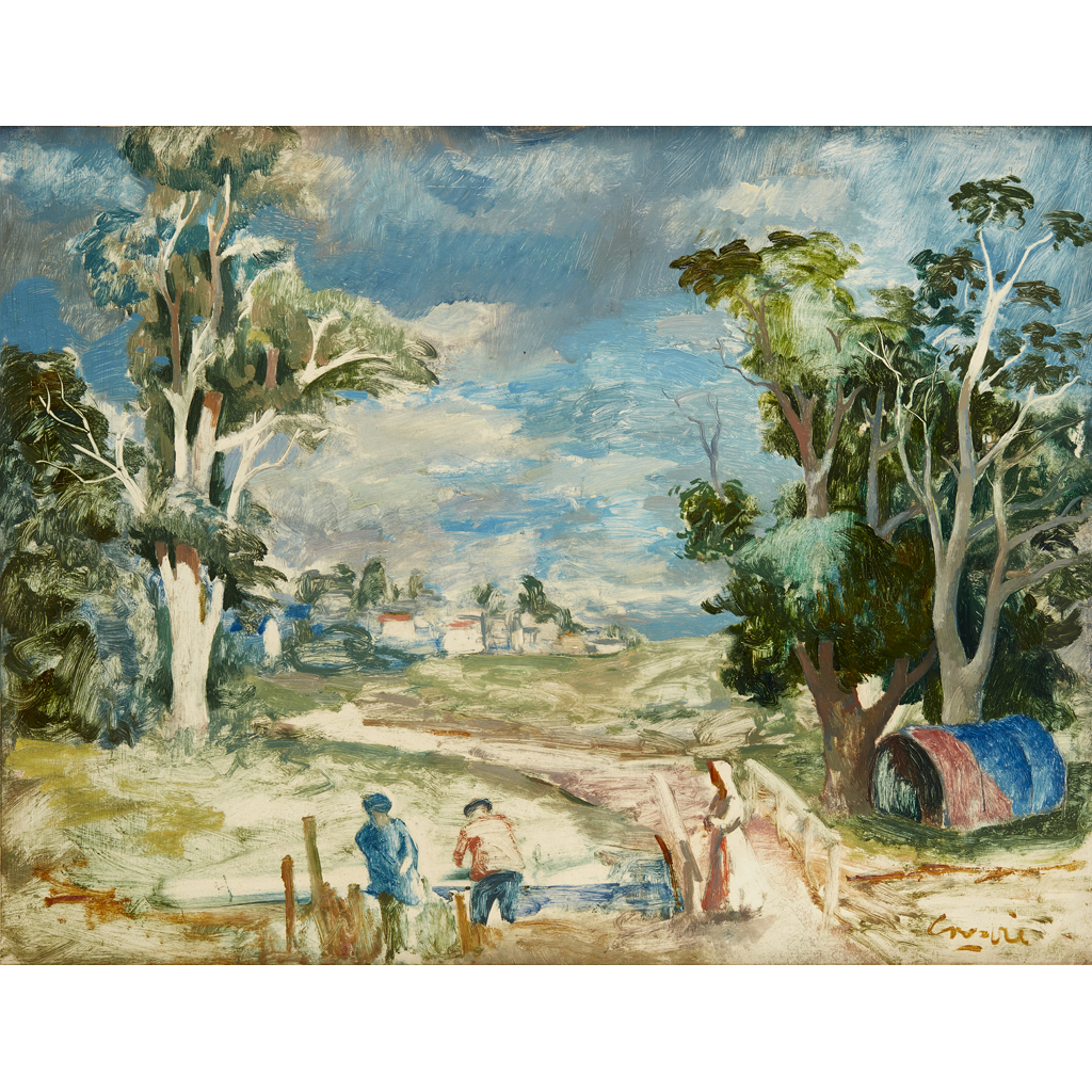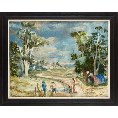 THE CAMP - CONTINENTAL LANDSCAPE WITH FIGURES BY A BRIDGE
