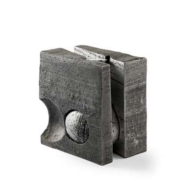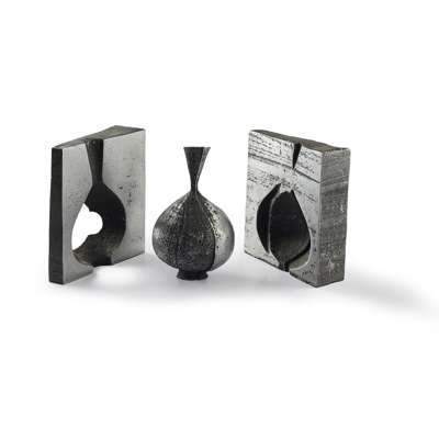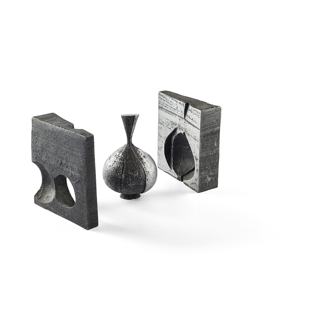 Consisting of three interlocking pieces, each piece embossed with initials and '911' on base, sand cast aluminium