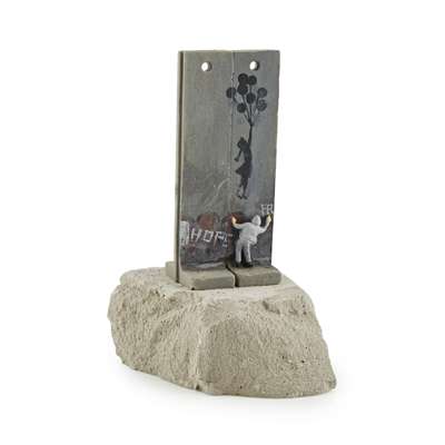 As described on the 'Walled-Off Hotel' website; "A mini stretch of separation wall decorated with recreations of well-loved graffiti. Lovingly hand painted by local craftspeople". This reproduction of the wall dividing Israel and Palestine was made by Banksy in corporation with local craftsmen exclusively for his Walled Off Hotel. It is only sold to residents at the Walled Off Hotel in Palestine and limited to a very small amount.
