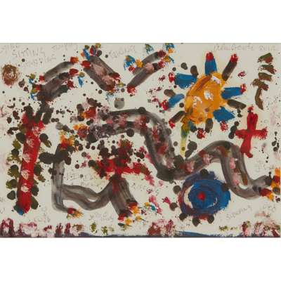 This sentiment remained Alan Davie’s guiding principle across an artistic career spanning over 70 years. Difficult to pin-down as an artist, he worked across disciplines throughout his life: as well as exhibiting his visual art internationally, he also designed and made jewellery, wrote poetry and performed music, particularly the saxophone, but also the cello and piano. He felt that these interests and outputs supported and evolved across each other, rather than existing as distinct entities.