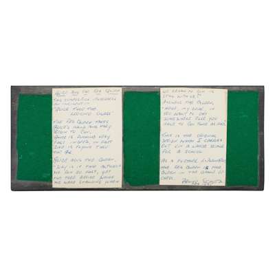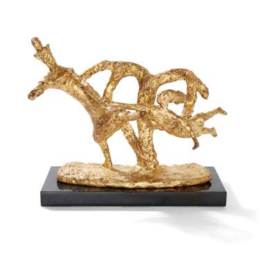 Signed, handwritten note affixed to base with date and explanation of design, bronze sculpture with gold patina
