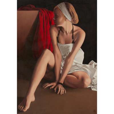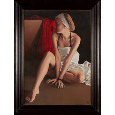 Biography: Dylan Lisle is part of a new wave of young modern Scottish artists. Finding inspiration in the masterful female forms and chiaroscuro of the Old Masters, Lisle’s work employs a similar technique and style. He contemplates light and texture in his paintings through the swathes of fabric which envelop his sensuous female sitters.
