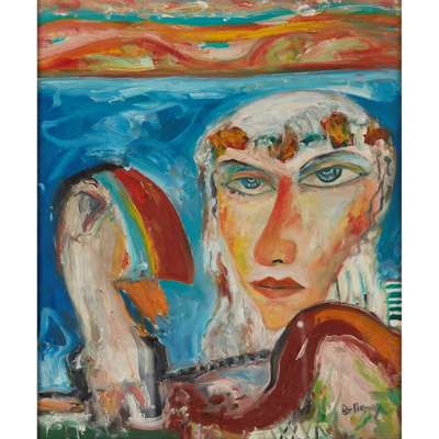 His artwork is almost entirely figural, with many of his portraits being of family members or female figures. Themes of Christianity, mortality and sin are seen throughout his paintings, especially during the 1970's, when the influence of alcohol resulted in a period of self-destruction in Bellany's life.