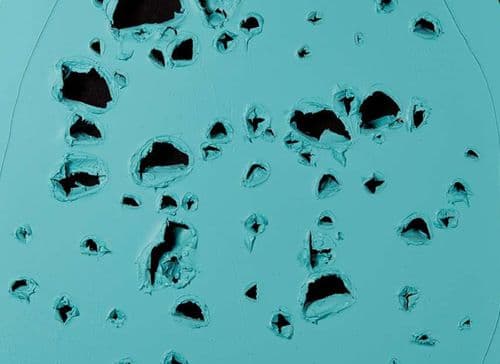 Turk has continually returned to the form of the egg throughout his career. The shape and concept of an egg is a heavily charged archetype, containing ideas of beginning and end, the alpha and omega, the inside and the outside. Turk explores these concepts in his work Holy Egg (Blue), an egg-shaped painting that is dramatically perforated to reveal Gavin Turk's initials subtly cast by the holes. The violent punctures on the surface serve to reveal the empty space behind the canvas whilst remitting the painting to a three-dimensional object, yet also alluding to Jesus Christ's stigmata.