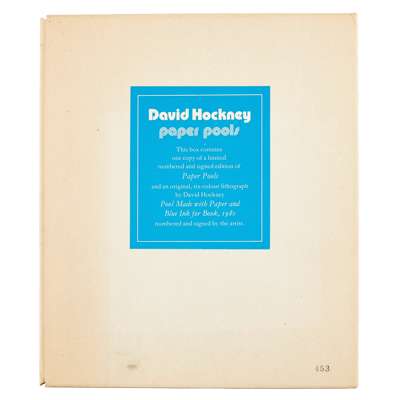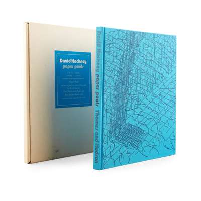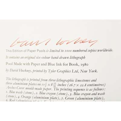 Paper Pools is a book chronicling a very specific moment in Hockney's creative process, a short period in 1978 when on route to California from England, he made a de-tour to Tyler Graphics studios in upstate New York, to visit friend and previous collaborator Kenneth Tyler. Here he was introduced to a new medium, the paper pulp process. This involved dyeing wet pulped rags, which were then applied in various ways to recently-created and still wet paper, until they were finally fully pressed and dried; there were opportunities for the artist to manipulate the application of colour at all stages. The result was a cross between paper-making, print-making and painting. Hockney found learning this new technique and its specific restrictions, creatively freeing. He realised the process could be very conducive to variations on a theme, and the swimming pool and the effects of different lights and movements on the water was captivating him once again - as he swam in and looked at Tyler's outdoor pool each day.