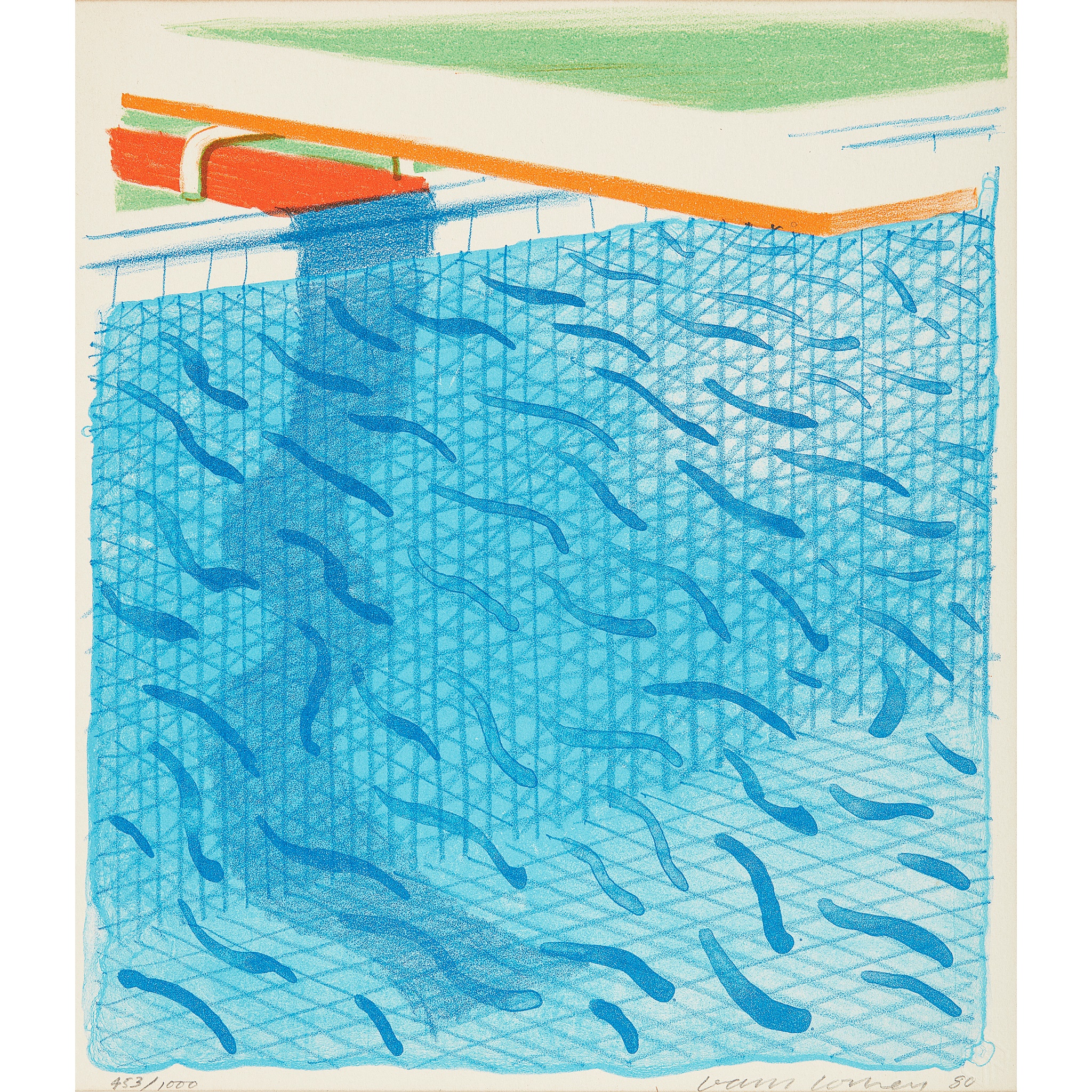 To celebrate the publication of the work, Hockney produced a six-colour, hand-drawn lithograph, which he signed and numbered. It revives his favoured subject, boldly depicting the swimming pool and diving board in strong colours. The gently rippling water is depicted with surface watery, wavy marks, overlaying the deeper, overlapping shadows - there is depth and movement, as Hockney manipulates different effects of lithographic mark-making.