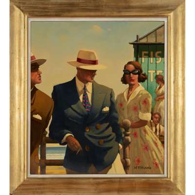 Hailing from the same period as ‘The Singing Butler’, this work from his series ‘Ritual of Courtship’, captures the quintessence of what so appeals to the public about his painting. Bathed in the golden glow of summers past, his figures wear the distinctive style of the 1940s, from the capacious double-breasted blazer of the central figure to the cat-eye flicks of the lady’s sunglasses.