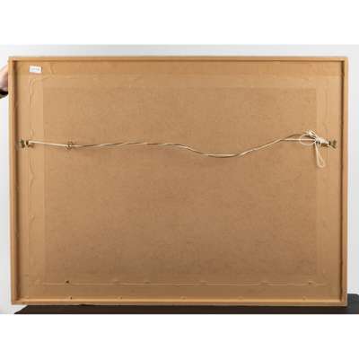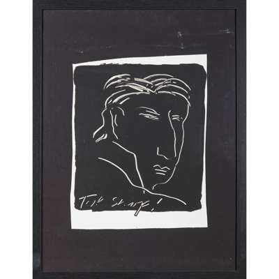 Bruce McLean’s distinctive, irreverent practise is hard to pigeon-hole and his multi-disciplinary approach attests to this, with the artist noted for his work across the mediums of painting, print-making, sculpture and performance. An alumni of the Glasgow School of Art and Central Saint Martins, McLean’s impact on the artworld was immediate and has proved long-lasting. At the tender age of just 27, McLean had a solo exhibition at the Tate Gallery in London before going on to teach art, most notably becoming Head of Painting at the Slade School of Fine Art. His teaching practise and forthright, colourful approach to his own work has influenced subsequent generations of British artists.Lyon and Turnbull are delighted to offer some rare to market early career works by this enigmatic figure. They were painted in McLean’s garage studio in Barnes during the period between the spring of 1983 and 1984 after McLean had returned from some time in Berlin. He found the space and the domestic situation around it immediately congenial and it was close enough to home for him to work in a way that suited his temperament; at odd times of the day or night, unpredictably and spontaneously.These pieces were part of a body of paintings that have a marked stylistic unity. Though his work is characterised by a sense of fun and approachability, it is in fact frequently underpinned by political discourse, stemming directly from a belief in the centrality of art to the development of human consciousness and to social and domestic well-being. For example, in the case of Lot 136, we see one of his recurring motifs from this era of his work; the stepladder, with its connotations of social ascent and descent. These garage paintings are notable for their extreme economy of means, directness of address, stark simplicity of style, gestural vehemence and passionate indignation.In 1991, photographer Alastair Thain published his photobook ‘Skin Deep’, the aim of which was to “offer an exploration of modern celebrity and myth”. The image here aims to tap into and capture the wit and irony with which McLean’s work often sought to lampoon, as well as more seriously question, the workings of the art world. Here, in typical style, we find him playfully subverting the trope of the ‘traditional’ portrait. Fellow artists also shot by Thain include Jospeh Beuys, Andy Warhol and Francis Bacon