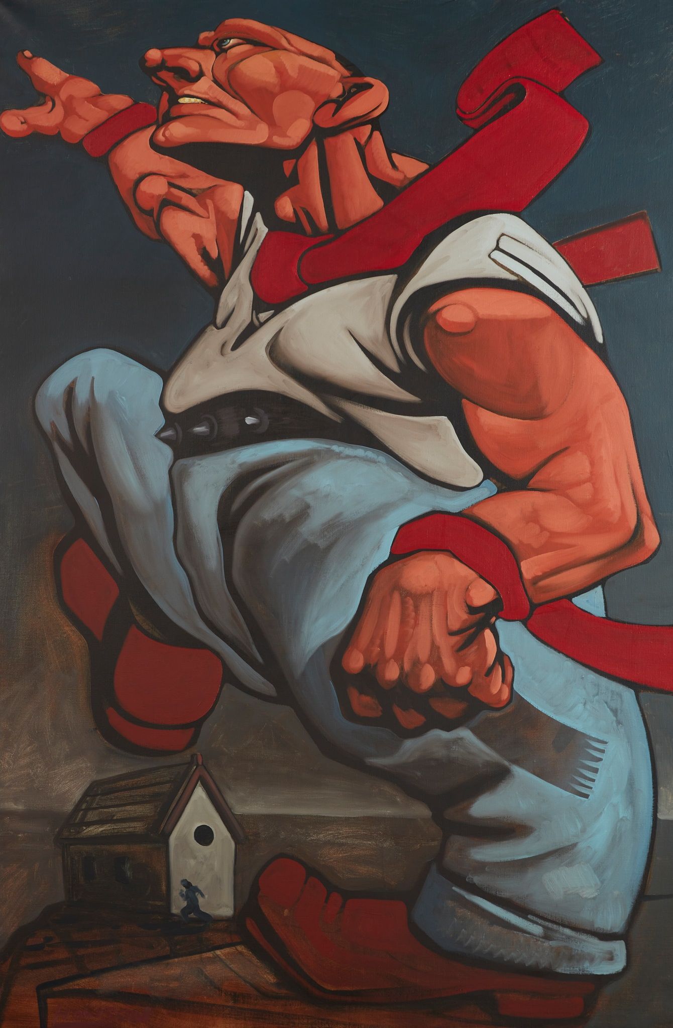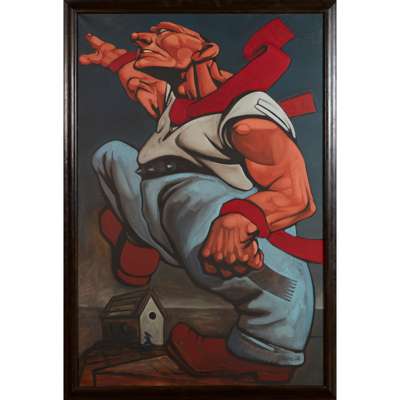 Howson tapped into his lived experience in the military and as a bouncer in the dive bars of Glasgow’s city centre to find his subjects. Lifting figures from memory, he pumped them up into exaggerated and overgrown character archetypes, through whom he examined the most toxic aspects of masculinity in order to reveal its ugly, destructive truth. Though the acerbic, grotesque social commentary of Weimar Republic artists like George Grosz and Otto Dix are clear reference points, Howson’s work is in fact brimming with pathos. He allows his characters a tragic heroism, and his message is clear that they are just as much the victims of the violent systems they embody. Here, in this relatively early work from 1991, he takes ‘Nijinsky’, the much-lauded early 20th century ballerina, as his subject. Howson created a series of four monumental works on this theme, of which this is likely one. On this series, the critic Peter Jenkins commented: “Nijinksy I see as a heroic figure: clumsy yet nimble, his macho prance is a dance of defiance; his leaden, booted feet may hold him down, but his head is in the clouds, jaw jutting; like a dancing bear, he is a noble beast made an object of derision…”