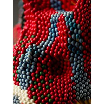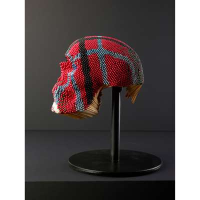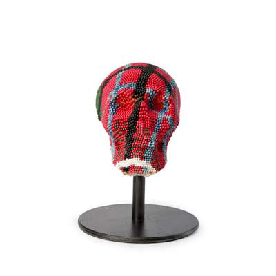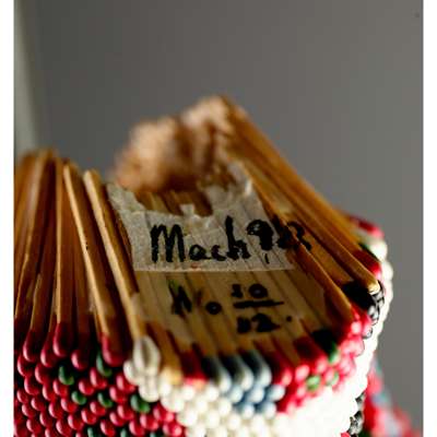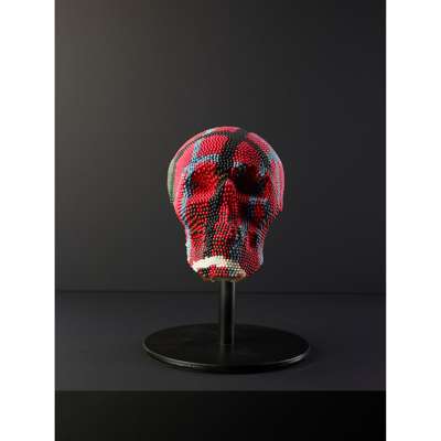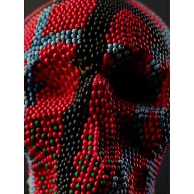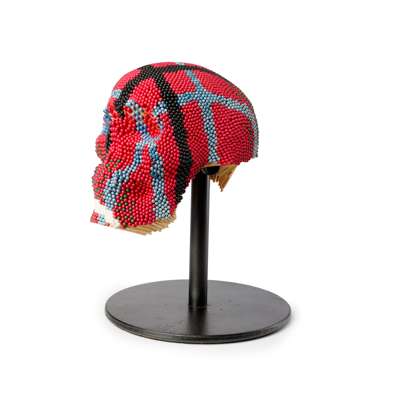 The sculpture Head is a multi-coloured, patterned skull made up of coloured, unstruck matchsticks, probably sourced from Japan. The ordinariness of the component objects, in this case the matchsticks, but often also wire coat hangers, magazine pages, tyres or bricks belies the laborious nature of turning them into the artworks and the visual extravagance of the end result of Mach’s work. Head is visually arresting, a classical skull transformed into a richly-coloured and patterned piece of modernity. The uniformity and repetition of the matchsticks and the symmetry and coherence generated is particularly compelling, with a real tactility, yet the threat of combustion is always present. A skull invokes notions of death and this entire structure is made of items designed to spark flames but it is simultaneously steeped in humour and fun. How could a sculpture made entirely of brightly coloured matchsticks take itself too seriously?