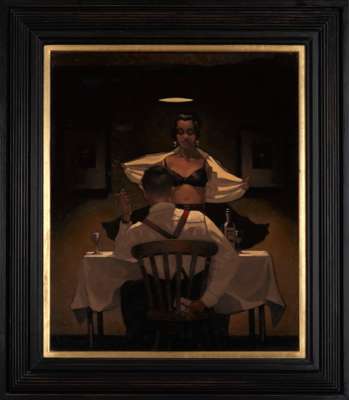Note: From the beginning, Jack Vettriano’s paintings have evoked a distinctive and fully-realised world, and his work is therefore instantly recognisable. Dimly-lit Deco-style bars, bedrooms and restaurants are haunted by figures clad in elegant dresses and well-cut suits reminiscent of the 1930s. ‘It’s a perfect world I would like to have lived in’ Vettriano has commented. Yet his paintings go beyond nostalgic odes to a bygone era; they are also expressions of the artist’s worldview, so replete with longing and loneliness that they often read like stills from a film noir. Much of Vettriano’s work explores the complex dynamics at play throughout the rituals of courtship and seduction, exemplified by ‘Busted Flush’. It is arguably his talent as a narrative painter that makes the vignettes he conjures so compelling.