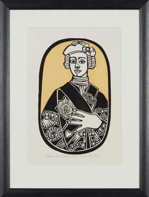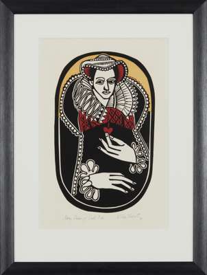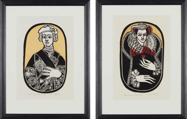 Note: Scottish printmaker Willie Rodger designed the award-winning Scottish Historical Playing Cards in 1974 for Angus Ogilvy of the Stirling Gallery. The original designs were cut in lino, his favoured printmaking medium, before bring printed as screenprints in an edition of 100 in 1975. The full set comprises 12 portraits depicting important figures in Scottish history, with two jokers: John Knox and Adam Smith.