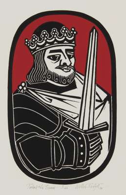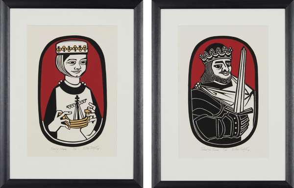 Note: Scottish printmaker Willie Rodger designed the award-winning Scottish Historical Playing Cards in 1974 for Angus Ogilvy of the Stirling Gallery. The original designs were cut in lino, his favoured printmaking medium, before bring printed as screenprints in an edition of 100 in 1975. The full set comprises 12 portraits depicting important figures in Scottish history, with two jokers: John Knox and Adam Smith.