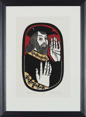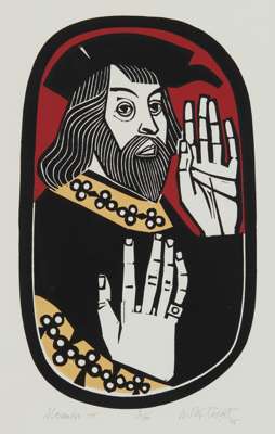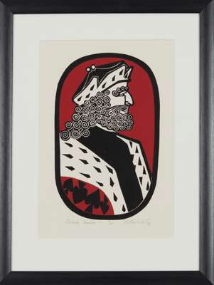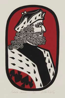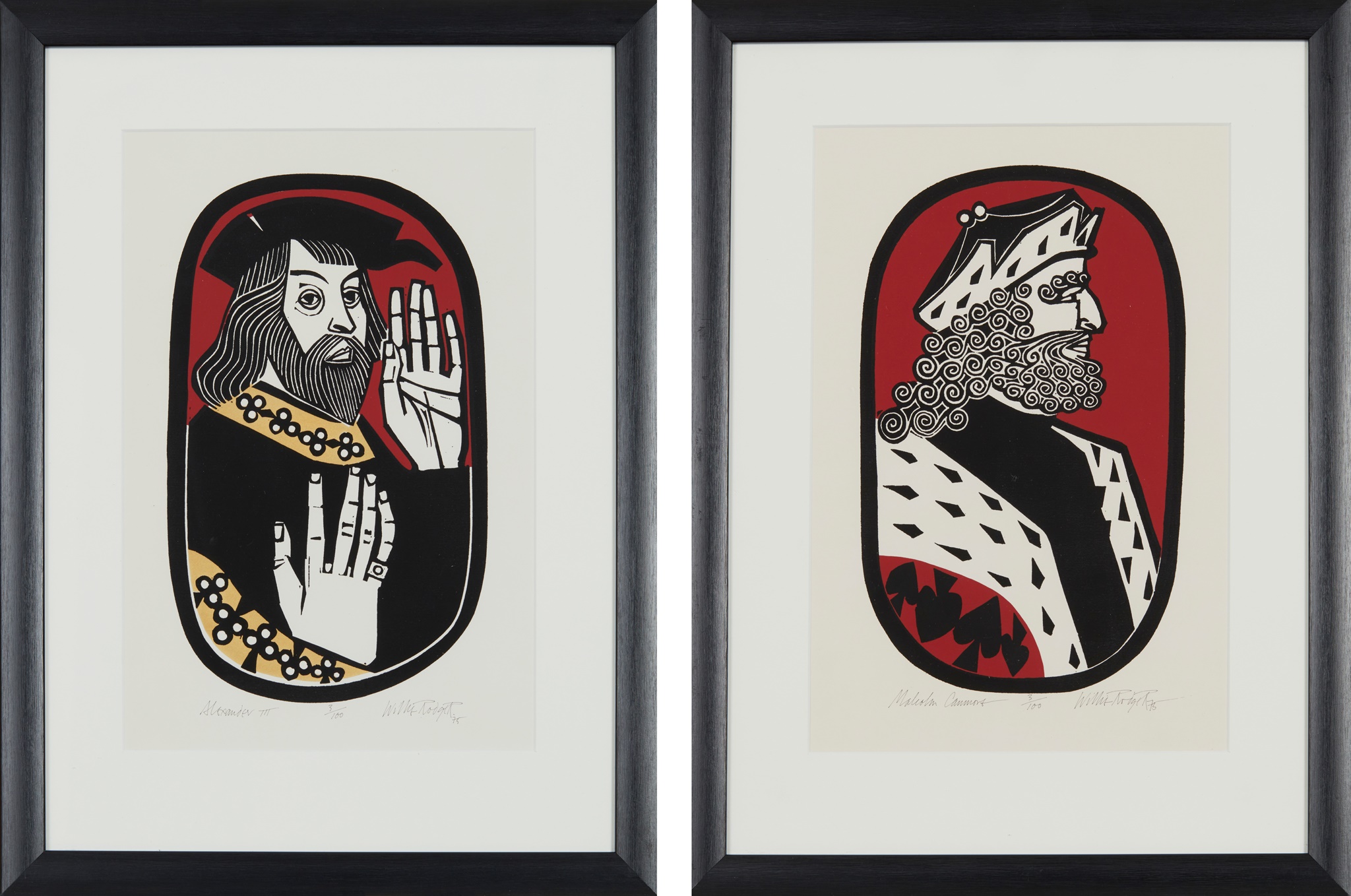 Note: Scottish printmaker Willie Rodger designed the award-winning Scottish Historical Playing Cards in 1974 for Angus Ogilvy of the Stirling Gallery. The original designs were cut in lino, his favoured printmaking medium, before bring printed as screenprints in an edition of 100 in 1975. The full set comprises 12 portraits depicting important figures in Scottish history, with two jokers: John Knox and Adam Smith.