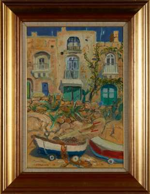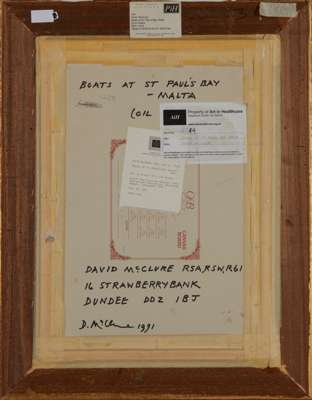 David McClure’s Boats at St Paul’s Bay, Malta of 1991 is a joyful late work which he painted the year after being elected a member of the Royal Glasgow Institute of the Fine Arts. The vibrant holiday image is full of colour emboldened by warm sunshine, as the eye is led from the boats in the foreground to the topmost window of the buildings beyond.