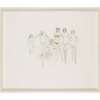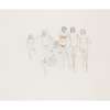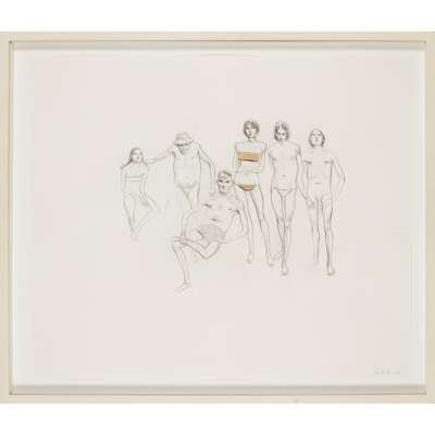 These two drawings relate to Avery’s long-term project The Islanders, a painstakingly detailed alternative world that the artist has created. Through drawings, texts and objects Avery describes the inhabitants, architecture, philosophies, customs and idiosyncrasies of this imagined world, part Scottish Hebrides, part East London. The Island sits at the centre of an archipelago, its capital the port city of Onomatopoeia, described by Richard Ingleby as ‘originally a stepping off point for pioneers and travellers, turned bustling boomtown, turned citadel, turned depression ravaged slum, turned regenerated city of culture’. In these two drawings, we see the denizens of the Island at rest, a riff on the traditional art historical motif of ‘bathers’, albeit transferred to hotel pools and public baths. Their swimwear, has a time- and space-shifting quality, taking us back to the 70s and possibly to the Eastern Bloc, yet at the same time, the poses and expressions feel very contemporary, with their combination of awkwardness and poise.