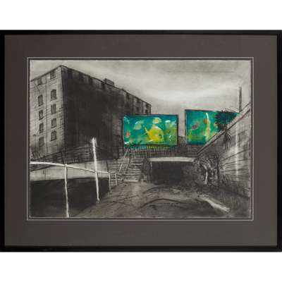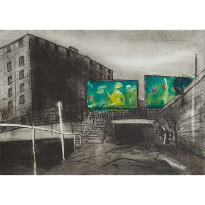 Note: On her website, the artist discusses the inspiration and technique in this work: This work was developed during a printmaking residency at Lowick House in Cumbria. Much of my art towards the end of the last century was based on this industrial corner of Leith in Edinburgh. Like all the best city rivers, the Water of Leith flows through from pastoral to post industrial in seconds, and this is a particularly interesting section of that river. The embedded monoprint within each of these etching relates to the billboard dreams that glow even in the murkiest places. The contrasting subject has its echo in the contrasting intaglio versus relief printing methods. The edition is variable as each monoprint had to be remade, though the steel plate surround is a constant.
