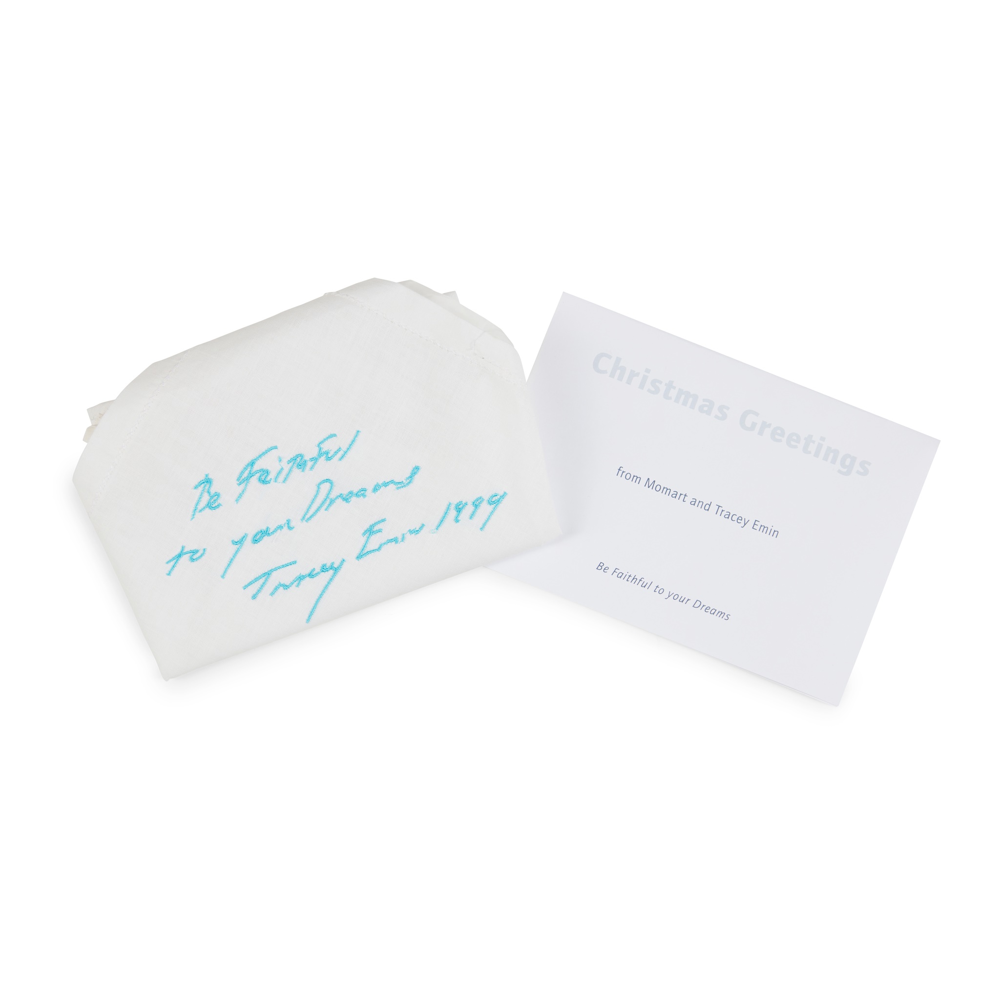 Embroidered cotton handkerchief, with embroidered signature, title and date, from the edition of an unknown size, published by Momart, London, housed in the original plastic packaging