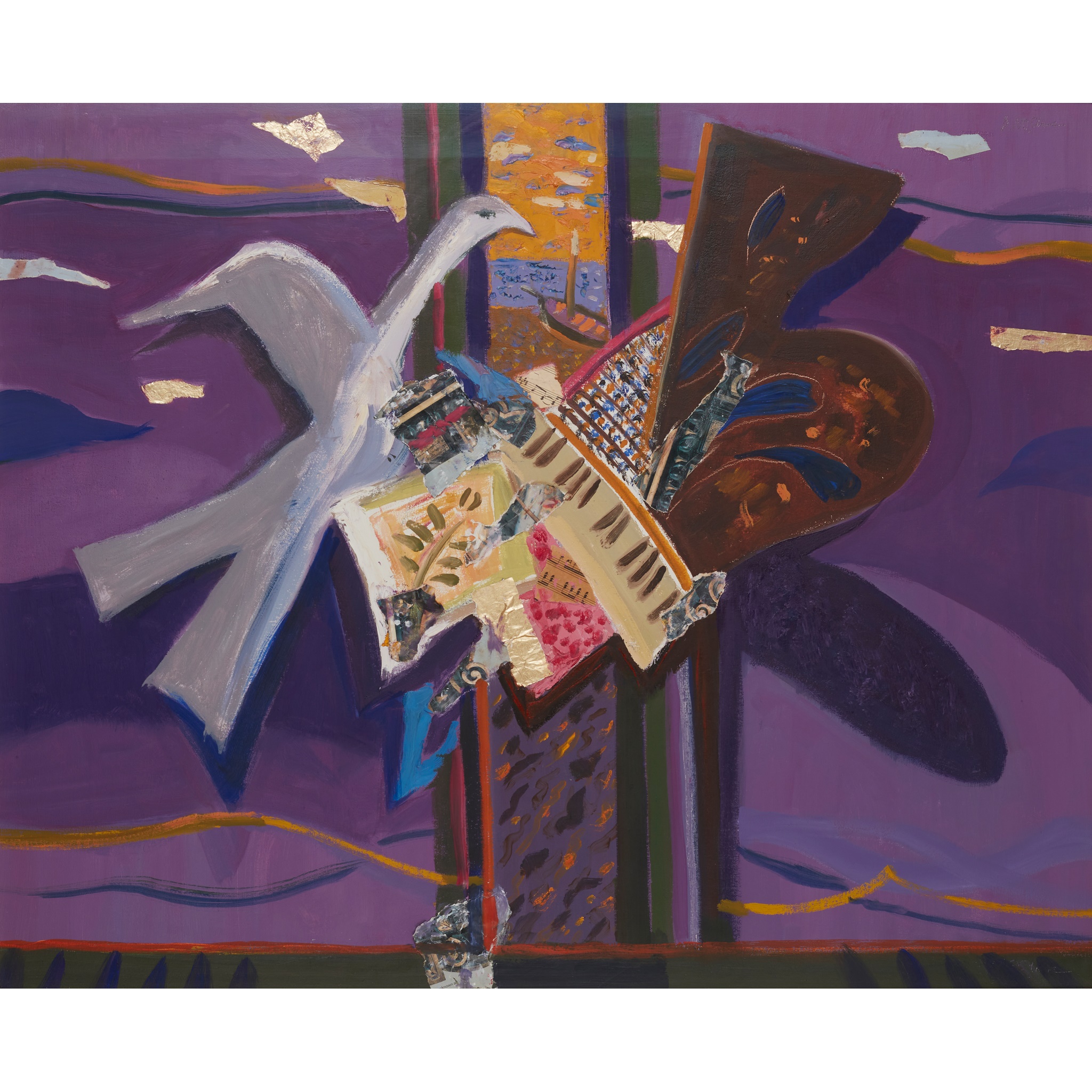 Signed upper right, signed and titled to backboard verso, oil and collage on gesso