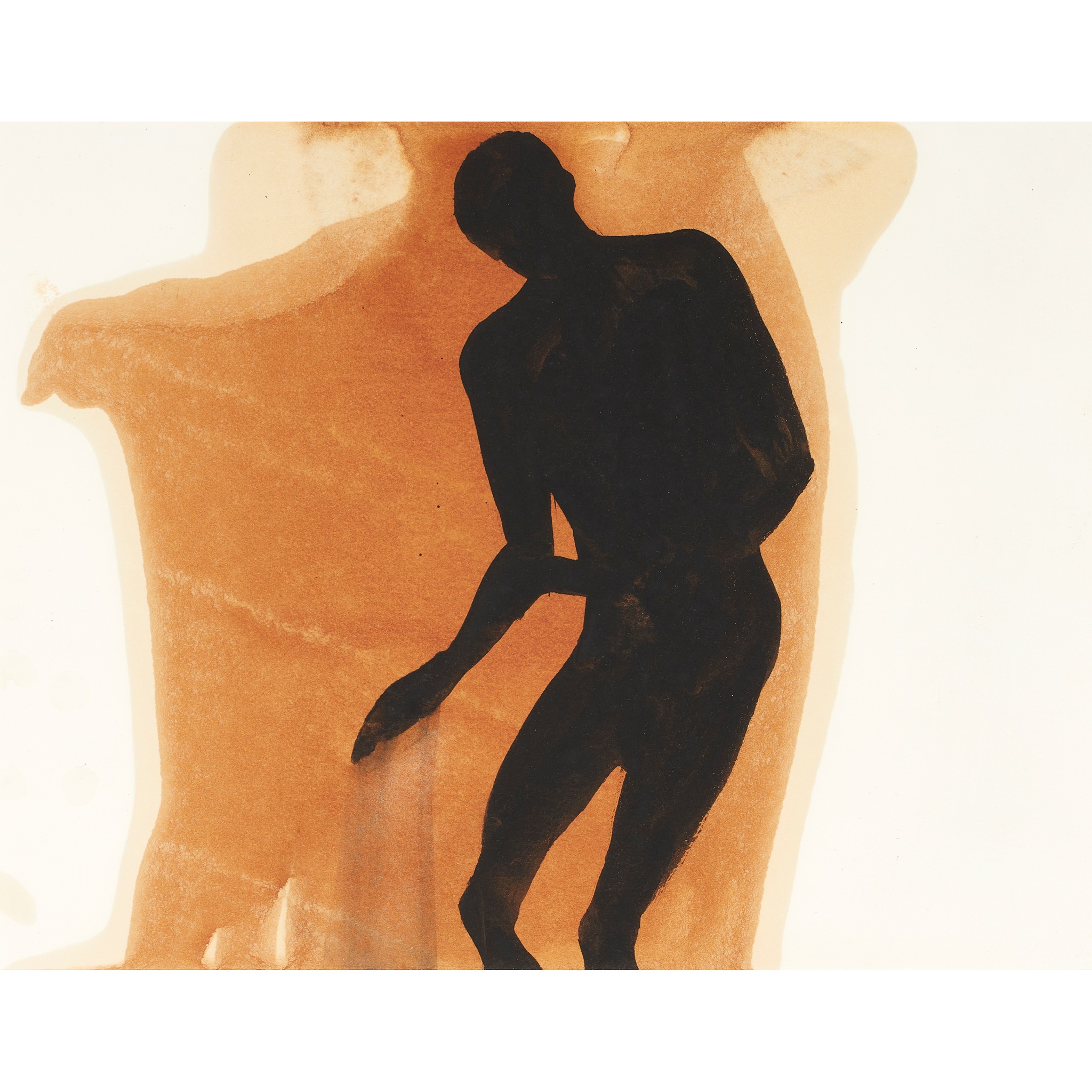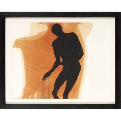 The stance of the figure in ‘Sensing’ suggests a state of suspension; the spectral ochre pigment implies an emanation beyond the confines of the human body. Antony Gormley is one of Britain’s leading contemporary artists, whose work interrogates the relationship between the body and the space it occupies. Gormley is best-known for his sculpture, but throughout his career he has also produced drawings and paintings as a vital part of his practice. He thus joins a rich tradition of sculptors who were also talented and prolific draughtsmen, and whose drawings enabled meditations on form that could then be transposed into three dimensions. Gormley’s works on paper are often rendered with watercolour as well as more experimental substances including chicory coffee, aniline dye, shellac and blood, each imparting a unique quality to his quality of line.