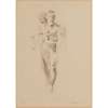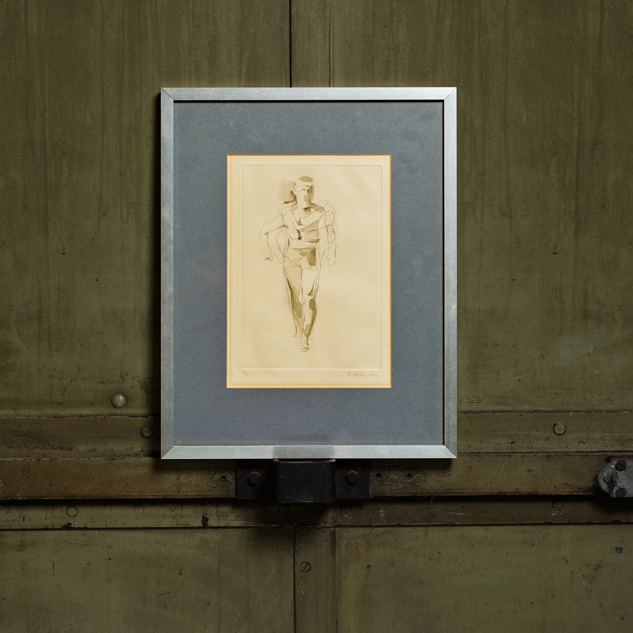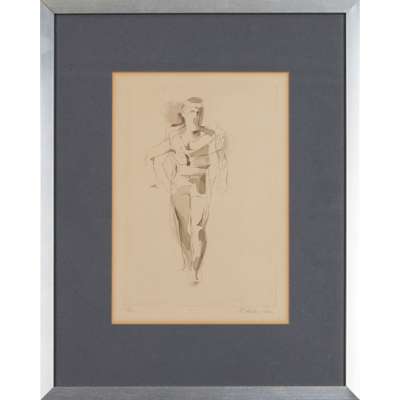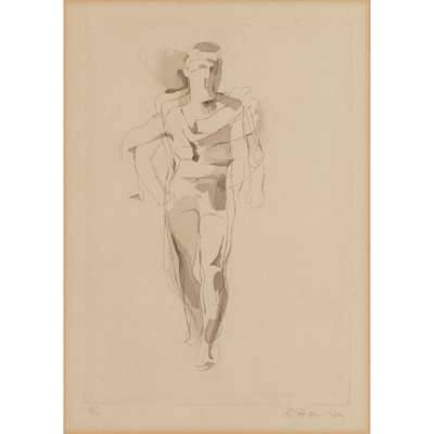 Richard Hamilton became one of the most significant artists of the twentieth century. He had a strong artistic output, influential teaching career, and the distinguishing claim of being the first artist to define ‘Pop’ art in 1957: ‘Popular (designed for a mass audience), Transient (short‑term solution), Expendable (easily forgotten), Low cost, Mass produced, Young (aimed at youth), Witty, Sexy, Gimmicky, Glamorous and Big business.’ Art would never be the same again. These compelling intaglio prints pre-date Hamilton's discourses on Pop. Dating to shortly after his graduation from art college, they show Hamilton playing with form and technique and offer a glimpse of some of the themes that would continue to preoccupy him throughout his artistic career, even as he continued to innovate and evolve. Man Walking (After Muybridge) takes as its source one of the iconic and pioneering photographs taken by Eadweard Muybridge in an attempt to capture and convey movement. Although not modern or new by the time Hamilton was engaging with the image as a source text, they represent a significant scientific and technological advance for the time, and at some level indicate an interest in modernity, so it is maybe not surprising that they would engage Hamilton who spent his life engaged with the ‘modern.’ Yet there is a classical element too: the depiction of the human form and its movement, the importance of technical skill in draughtsmanship and also in the use of the techniques of printmaking. This early work was both printed and published by the artist in a very small edition, and the contrast of the etched line and ‘wash’ finish of the aquatint is both playful in spirit and successful in the communication of movement.