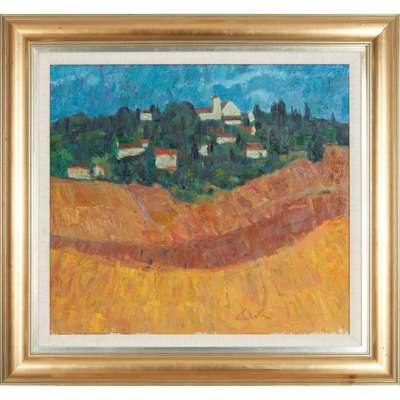 MEDITERRANEAN HARVEST FIELDS WITH HILL TOWN