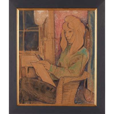 Carole Gibbons was born in Glasgow in 1935, and continues her art practice from her studio there to this day. A student of the Glasgow School of Art and member of The Young Glasgow Group collective, Gibbons was the first living female artist to be exhibited at Glasgow's Third Eye Centre. Despite a long and critically well-regarded career, with works featured in many institutional collections around the UK, Gibbons' work is only now really achieving the recognition it deserves. She was recently included in Tate's critically acclaimed exhibition Women in Revolt! Art and Activism in the UK 1970-1990. In 2023 her solo show at Celine, Glasgow was rated in Frieze Magazine's top ten shows of 2023. She has exhibited in New York and London in recent years, having recently been taken on by Hales Gallery, London, who are exposing her work to a new generation of collectors. As Hales note in their artist's biography, she has long been championed by artists Lucy Stein, Andrew Cranston, poet JF Hendry, art historian Susannah Thompson and her friend, the writer and artist Alasdair Gray. Here we see Gray sketching her portrait as a young woman and artist - her hands full of the tools of her craft, her eye considering the subject of her drawing, lost in concentration.