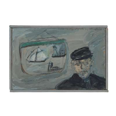 Inscribed ‘I wish I had an Alfred Wallis hung upon me wall’ upper right, signed verso, oil on board, and a further work by the artist ‘After the Fires', 1998, oil on board (2)