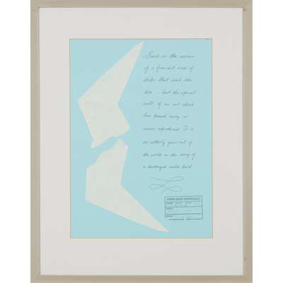 This work pertains to Wyllie's most famous artwork The Paperboat (1989). Art UK describes this piece as follows: 'George Wyllie’s 'Paper Boat' was built in 1989. It sailed through Glasgow, London, Antwerp, Dumfries and the East coast of Scotland. It made the front page of the Wall Street Journal as it berthed at the World Financial Centre in New York in 1990. Measuring an impressive 78 feet in length, the 'Paper Boat' had a steel frame clad in sheets of plastic and gauze, velcroed together, which opened to reveal a viewing platform, from which rose a question mark. Wyllie himself said, 'We used to build big ships like Queen Elizabeth and Queen Mary, and I thought we’re not building anything of any consequence now; we can only build paper boats. So I came up with this cock-and-bull story about an order from the Origami Line to build a paper boat.'