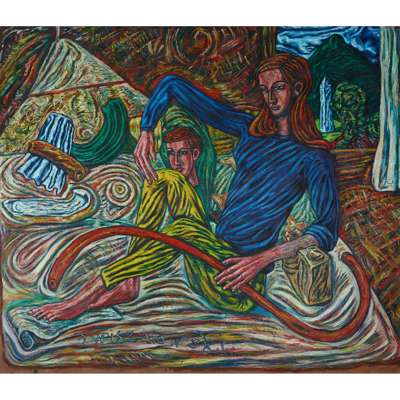 An oblique, poetic exploration of burgeoning adolescent sexuality typifies Wiszniewski’s subject matter, as does a current of melancholia. Akin to his peer and fellow ‘New Glasgow Boy’ Steven Campbell, there is something theatrical and mannered in his works, which again are often painted at a monumental, stage-set scale.