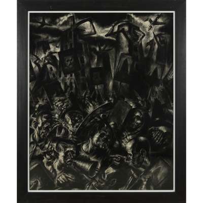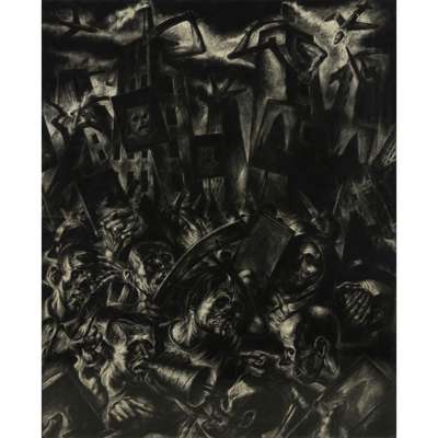 The current work was executed on hand-made paper created by Ken Currie and his friend Keith McIntyre who shared a studio on East Campbell Street in Glasgow, opposite the famous Barrowland Ballroom. McIntyre utilised pulped hospital bed sheets as the base material for this paper which lends this gritty image an extra dimension.