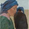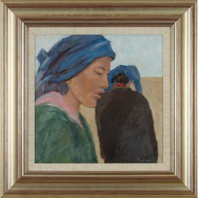 Inscribed by the artist to label verso: ‘Study of a lady I saw in Shigatse, the second largest town in Tibet. She was buying wool and wearing the blue scarf that so many Tibetan women were wearing.’