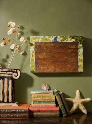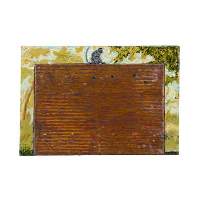The work offered here for sale is from a significant strand within his oeuvre, created by painting, lacquering, layering and collaging over a ‘found’ book cover base. His work is subtle and gently narrative, recalling the world-making intimacy of Vuillard and Bonnard.