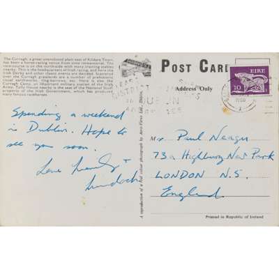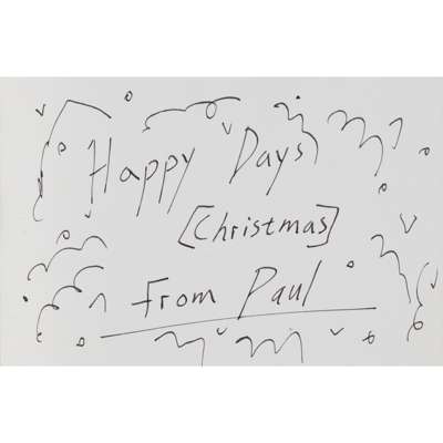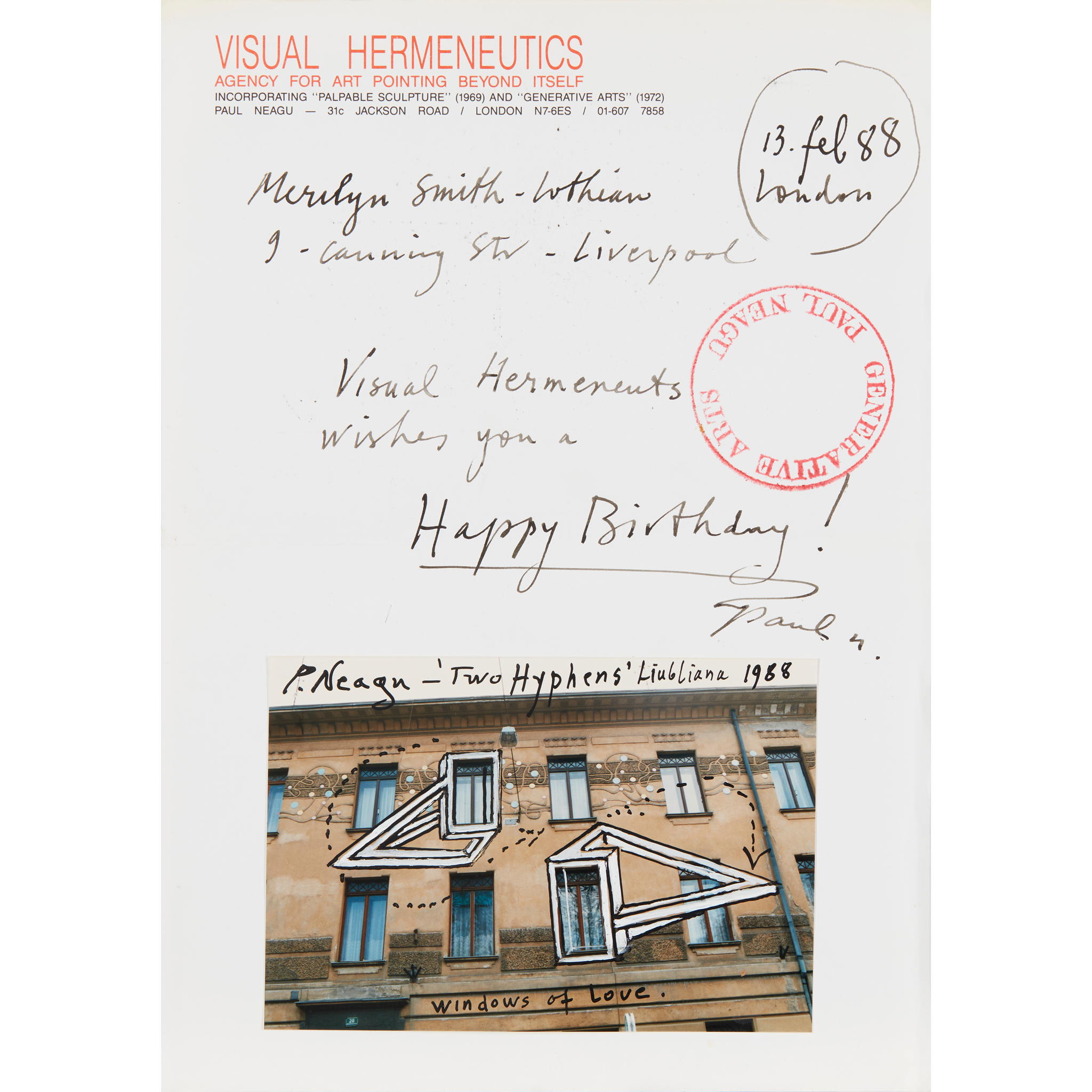 ‘Two Hyphens’, signed, inscribed “‘Two Hyphens’, Ljubliana, ‘Windows of Love’”, and dated 1988, mixed media on a photographic base pasted on ‘Visual Hermeneutics’ headed paper; ‘Happy Days (Christmas), 1985, ink on card; ’Postcard', 1980, inscribed ‘The race course - just ask for it!’, ink on postcard base (3)