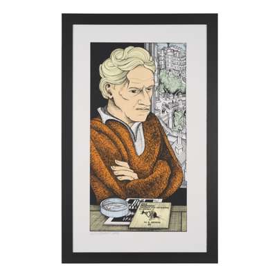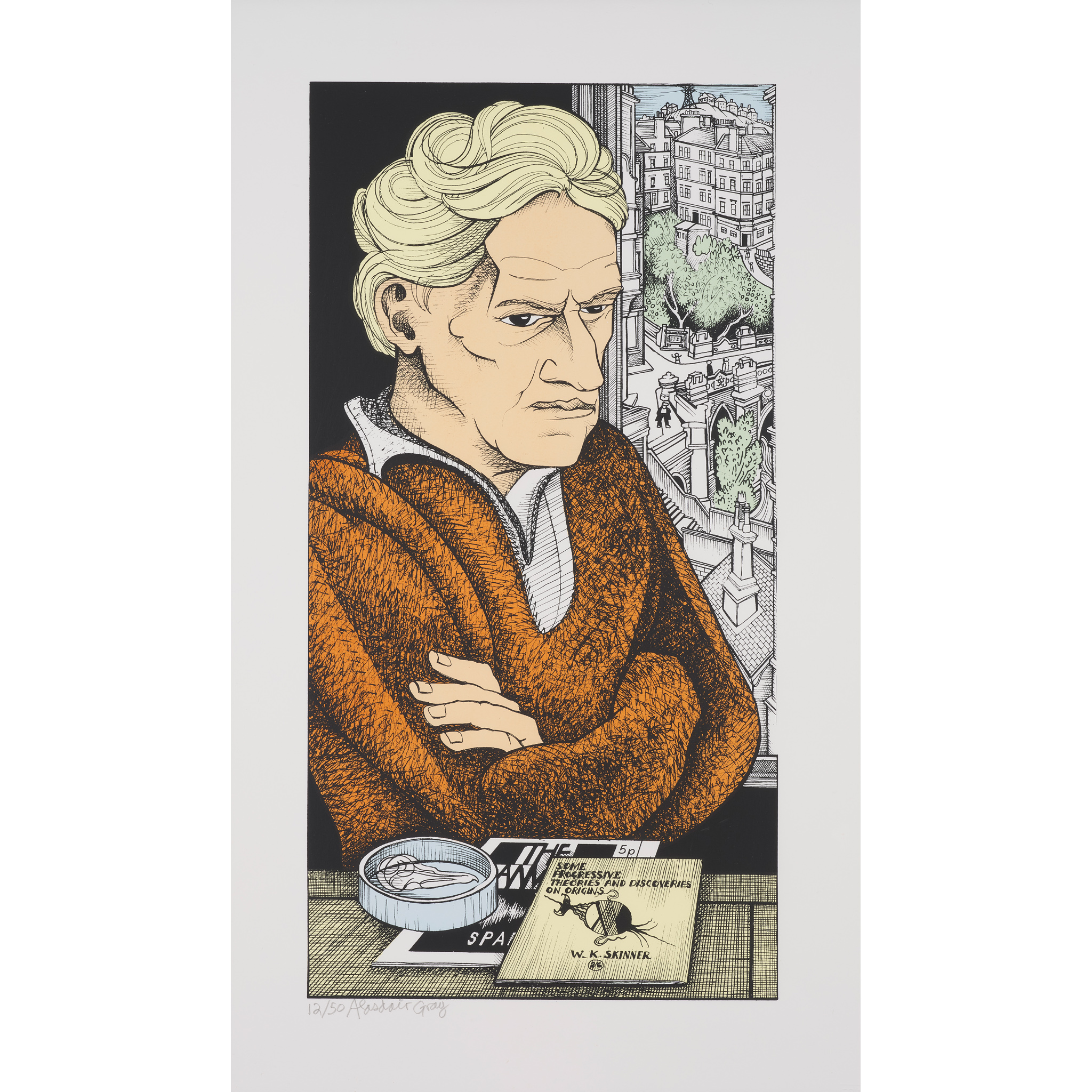 This is one of a small group of prints commissioned by Edinburgh Printmakers in 2011. All four were based on existing monochrome drawings by Gray but in the process of transferring into a print medium, bold colour was added. Gray was heavily involved in the process of creating the prints but as it took place during the Edinburgh Festival in August, he would often have to leave the studio to give talks and make appearances.
