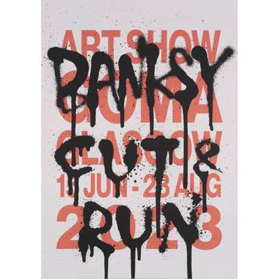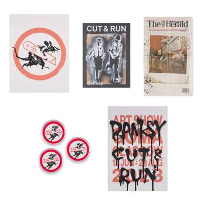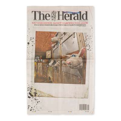 Two off-set lithographic posters, exhibition catalogue and three stickers in original cases, from the open edition, all produced to accompany the GoMA (Gallery of Modern Art) in Glasgow's exhibition of Banksy's stencils, 15th June - 28th August, accompanied by a souvenir edition of The Herald published to commemorate the end of the exhibition on 28th August (7)