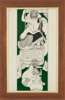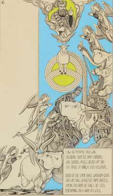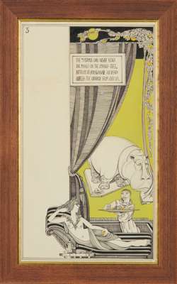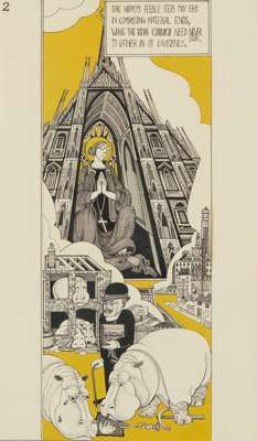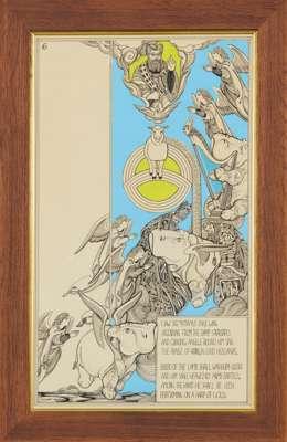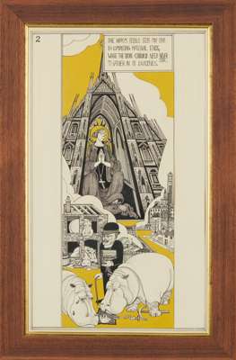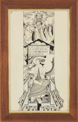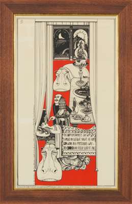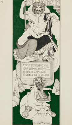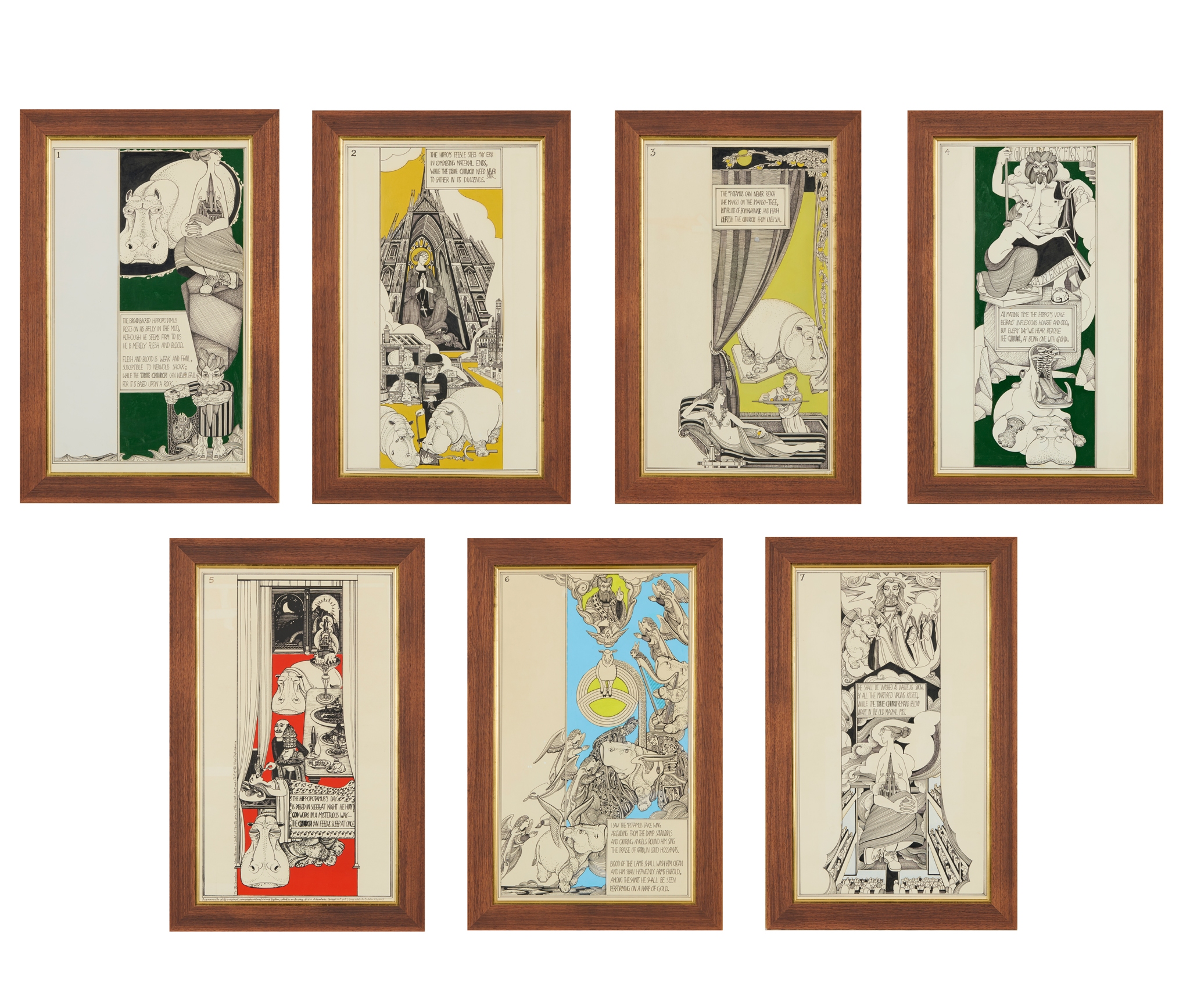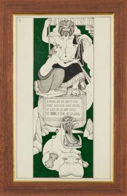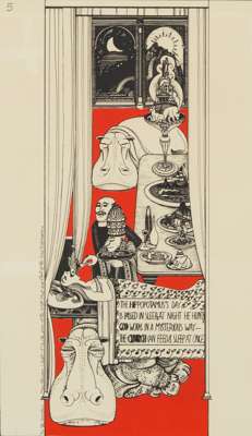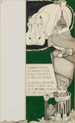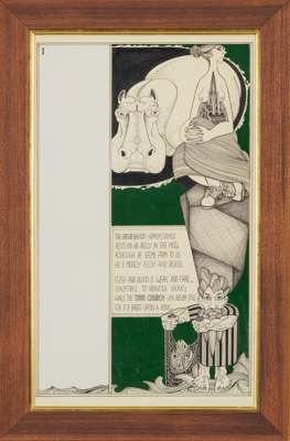 This set of mixed media works represents a fascinating insight into the working practice and dissemination of art by Scottish polymath Alasdair Gray. The present owner, a Glaswegian art lover and patron, decided to commission a piece from Gray in 1969-70, they were happy for him to develop it himself but working to a theme that interested them. On that basis, they requested that Gray create an unspecified work that explored the disconnect between the presentation and actions of the Church and their lack of alignment with the deeper teachings of Jesus. Alasdair Gray chose to use T.S. Eliot's The Hippopotamus as his subject.