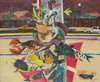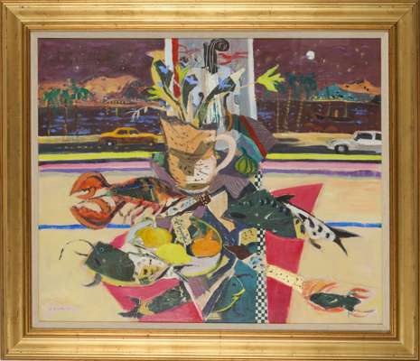 Signed lower left, signed, dated and titled to backboard, oil and collage on board