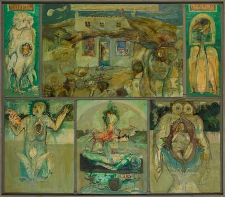 The artist remembers including two works in an exhibition with the title ‘New Contemporaries’ around 1971. The other artwork, Disintegration of Mankind, features five small panels mounted in a horizontal structure, similar to this one. It remains in her private collection and will be part of her major retrospective exhibition A Personal Odyssey at the Royal Scottish Academy this summer. The exhibition will feature a selection of works from the artist’s studio, dating back as far as 1969, when she was at summer school in Hospitalfield, following the end of her third year at art school. This striking painting was inspired by a period when she was living in a farmhouse called West Auchronie, near Skene. One other memorable aspect of this time was that one of her housemate’s granny had been rumoured to have had an affair with George Orwell.