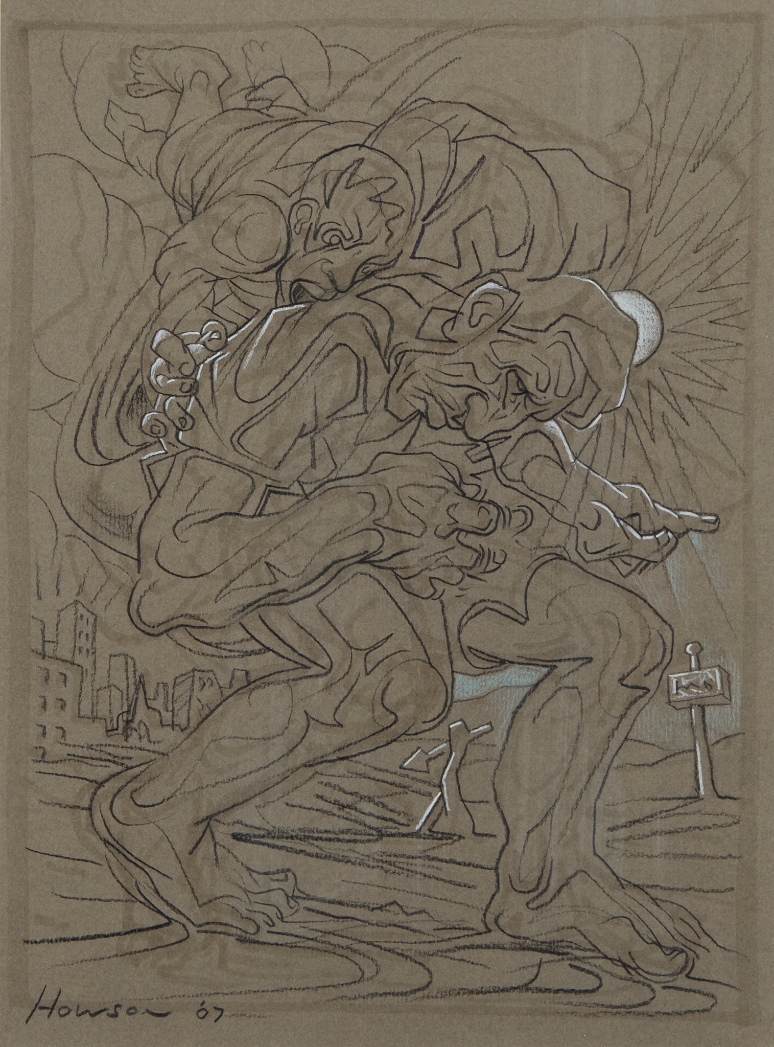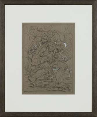 Signed and dated lower left, ink and pencil on grey paper
