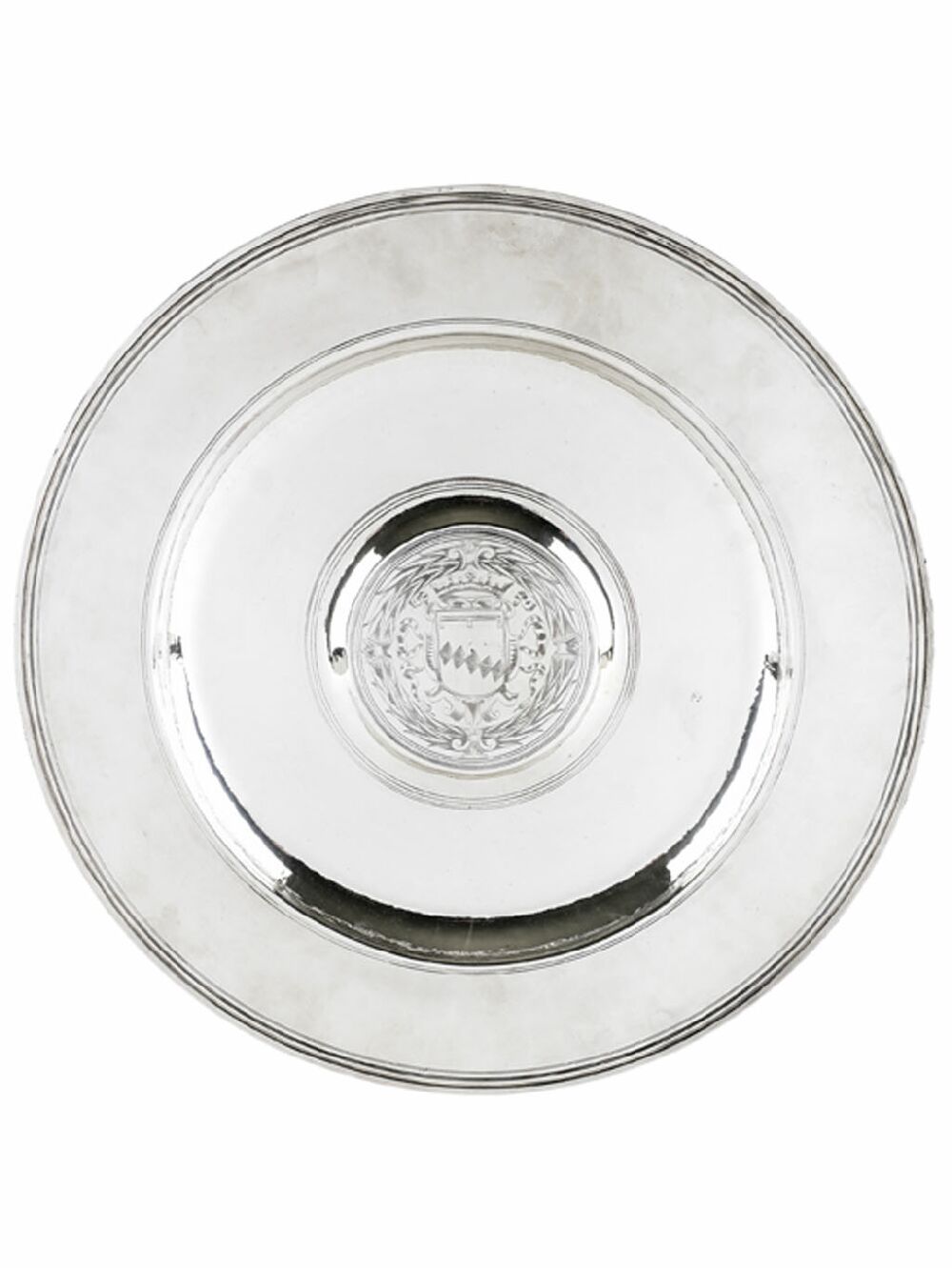 unmarked, with a simple threaded rim and plain broad border, the central raised boss with engraved armorials