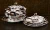 decorated with trellis work and stylised flowerheads to the border, and central chrysanthemum spray to the well, comprising: a large tureen, cover and stand; two smaller tureens, covers and stands, four graduated ashets; ten meat plates; ten fish plates; ten soup bowls; and ten side plates, green printed mark (50)