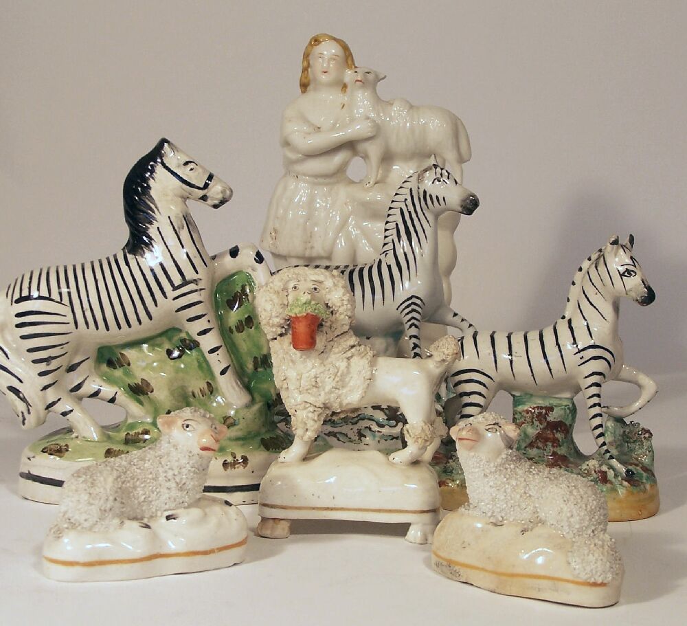 comprising: three various zebras, 15.5cm wide, 13.5cm wide and 12.5cm wide; a poodle holding a basket of flowers in its mouth, 9cm wide; a pair of seated sheep, 8.5cm wide; together with a moulded figure of a girl with a goat standing on a rock, 21cm high (7)